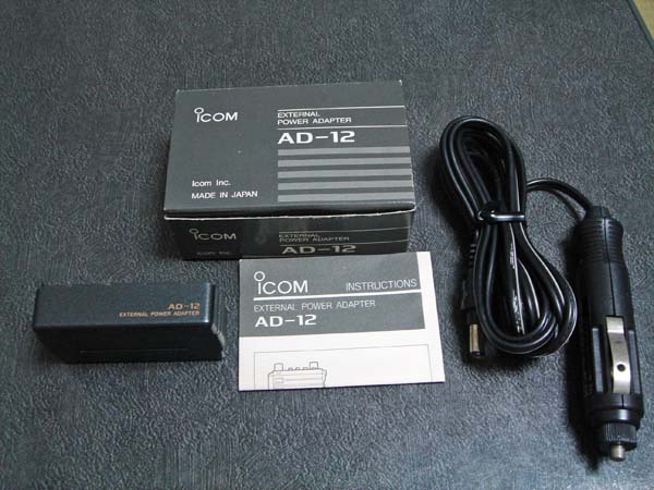 購入した外部電源アダプタAD-12(とオマケのシガープラグ)。中古無線機本舗で購入。1,600円なり(送料別)。