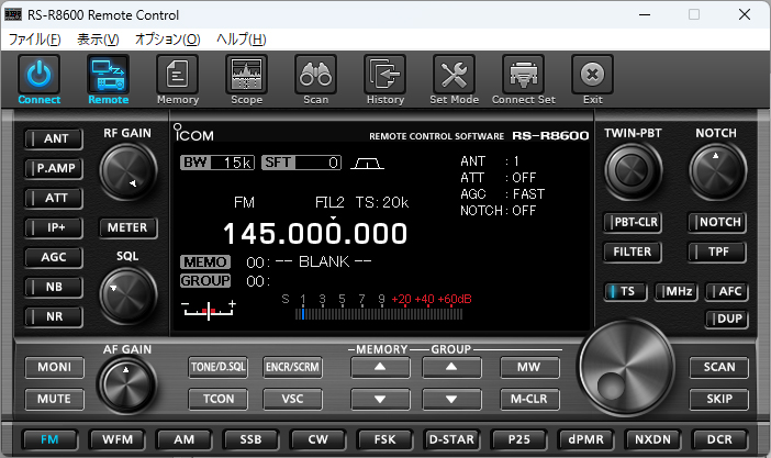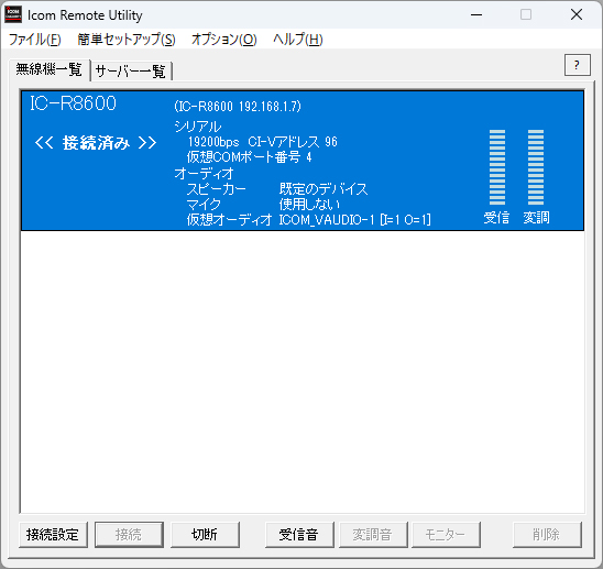 その後、RS-R8600 Remote Controlを起動して接続すると、IC-R8600を遠隔操作できます。