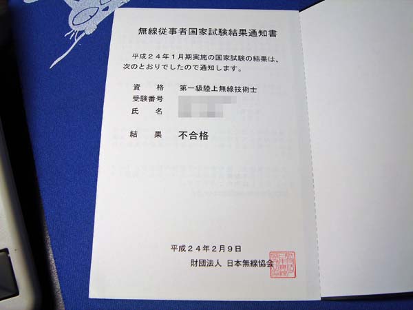 1月17日・18日に受験した、第一級陸上無線技術士(一陸技)の試験結果が届きました。