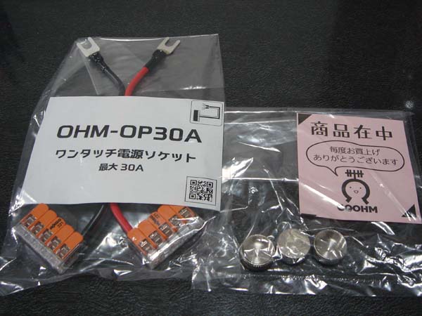 分配ケーブルOHM-OP30Aと、モービル基台用の防水キャップ3個。分配ケーブルが1,162円、防水キャップが1個163円なり。