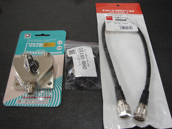 ダイワインダストリの「CS-201GII」はN型コネクタの同軸切替器、CQオームの「OHM-SN150」はSMAP-NPの1.5mケーブル、第一電波工業の「5D05N」はNP-NPの0.5mケーブルです。