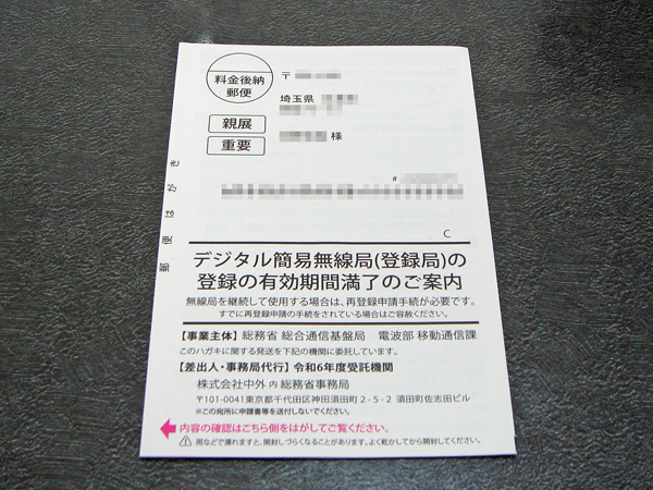デジタル簡易無線局(登録局)の、登録の有効期間満了の案内が届きました。
