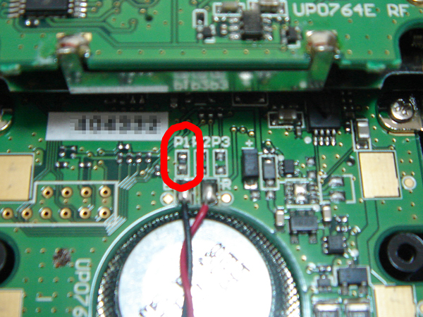 スピーカ上部にある、P1に実装されている0Ω抵抗を取り外します。