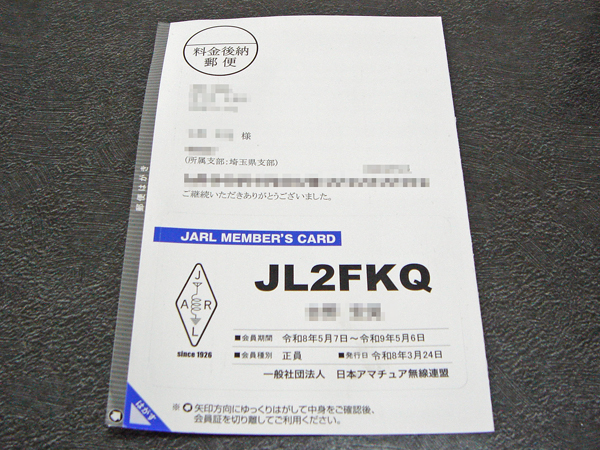 3月26日に、JARLの会員証が届きました。