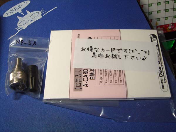 購入した、5D同軸用N型コネクタ「NP-5X」と、無地QSLカード。コネクタが880円、QSLカードが0円なり。