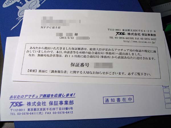 2日にTSSに送付した、社団局の開局書類。