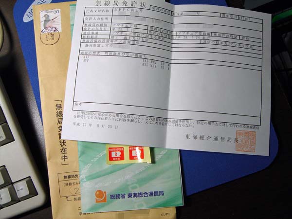 (コールサイン取得後に変更申請を行い、他の周波数・電波型式を追加する予定です)
