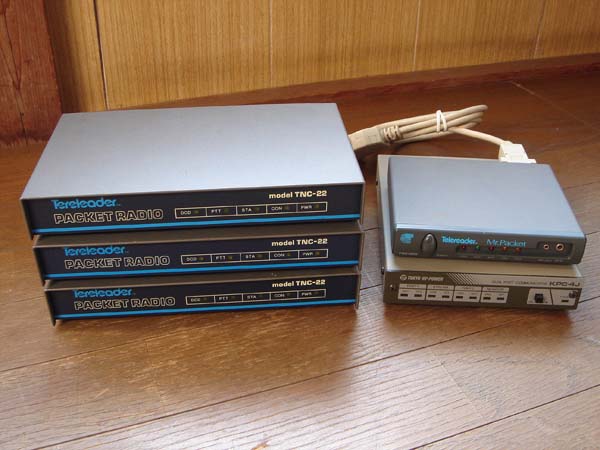 左の3台が、TneNetで使っていたタスコのTNC-22、右上はタスコのTNC-220(Mr.Packet)、右下は東京ハイパワーのKPC-4J。