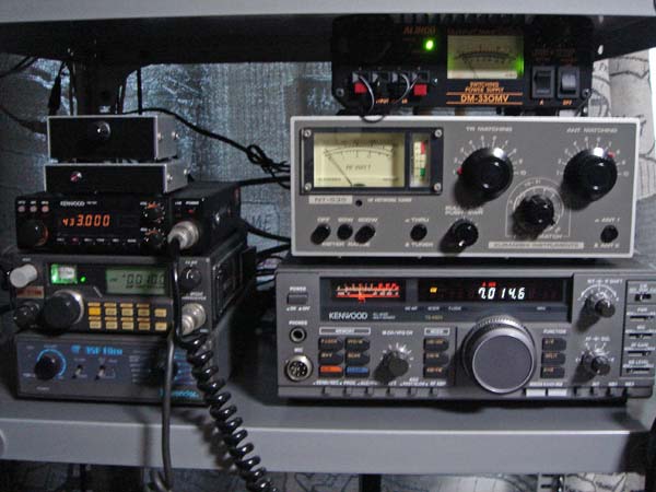 ケンウッドのTM-701の位置を移動させ、アンテナチューナの上に電源をのせています。
