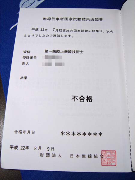 7月13日・14日に受験した、第一級陸上無線技術士(一陸技)の試験結果が届きました。