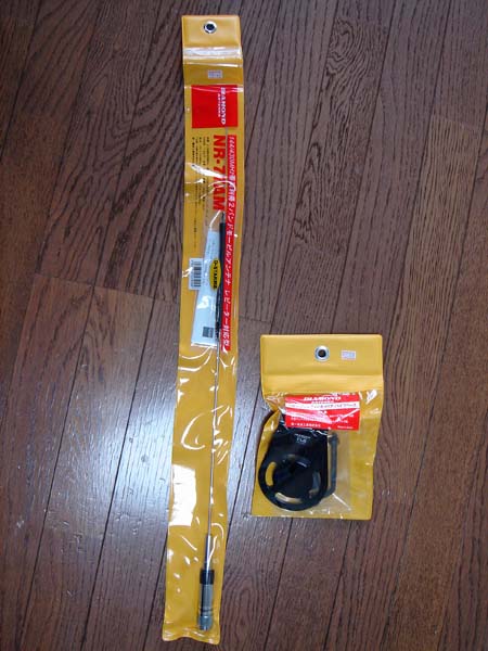 144MHz/430MHzとAM/FM帯のモービルホイップアンテナ、第一電波工業のNR77AMと、モービル用基台CLB。CQオームで購入。8,506円なり。