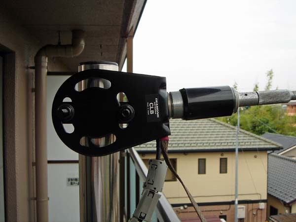 パイプに取り付けた基台CLBに、いつも使っているコメットのCA-HVというHF帯用モービルホイップアンテナを取り付けた様子。