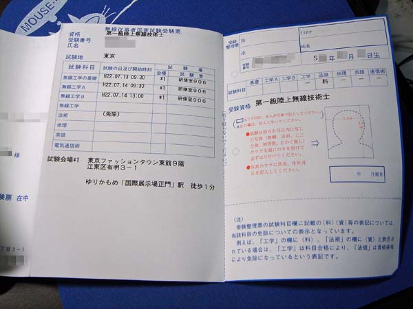 5月9日に試験申請をした、第一級陸上無線技術士(一陸技)の受験票が届きました。