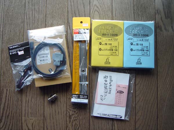 左から、バーテックススタンダードのDCケーブルE-DC-6と、CATケーブルCT-62、第一電波工業のベランダ取り付け金具BK10、CQオームのQSLカードお試しセットと、広告付きのお試しQSLカード、MJ-MJの中継コネクタ。合計で7,262円なり。