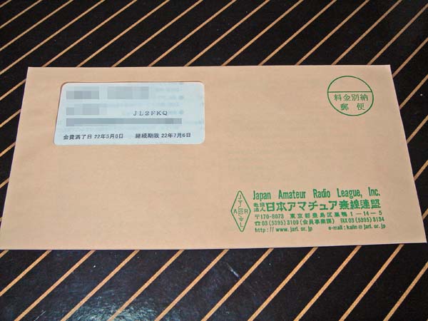 JARL(日本アマチュア無線連盟)から、会員継続の案内が届きました。