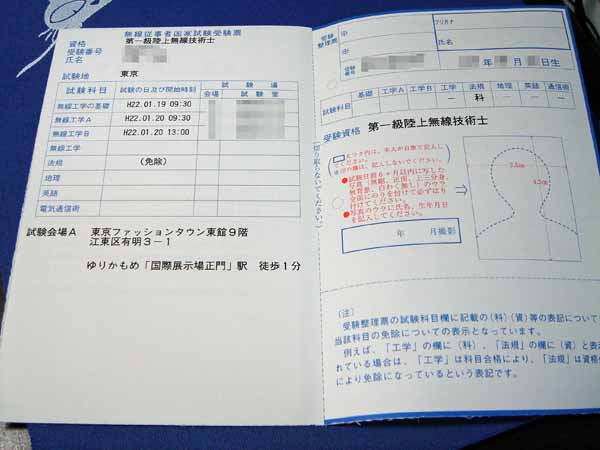 11月2日に試験申請をした、第一級陸上無線技術士(一陸技)の受験票が届きました。