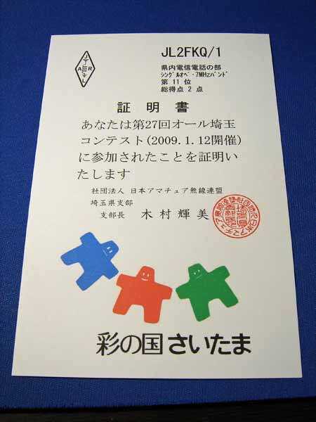 今回は、QSLカード20枚と、オール埼玉コンテストの参加証明書が届きました。