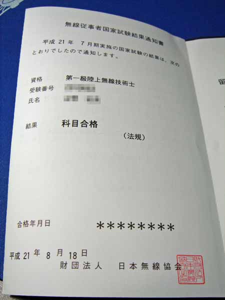 岩手県に行っている間に、7月に受験した、第一級陸上無線技術士(一陸技)の試験結果が届いていました。