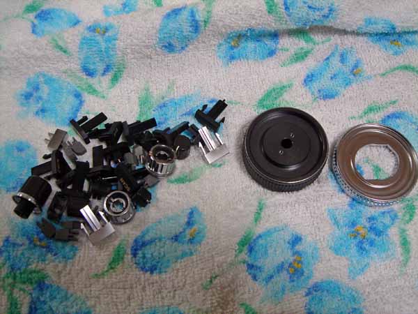 スイッチ・つまみの類も取り外し、ぬるま湯+中性洗剤で洗います。