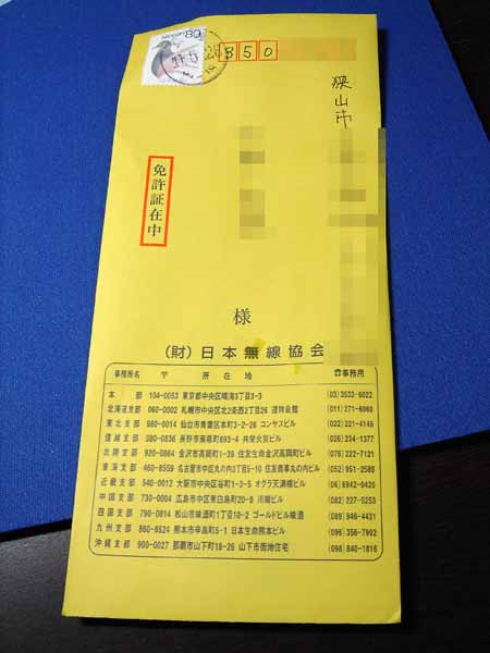 日本無線協会経由で申請したので、この黄色の封筒で到着です。