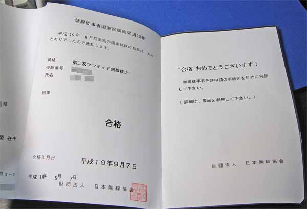 実は、平成19年8月期の第二級アマチュア無線技士の国家試験を受験していました。