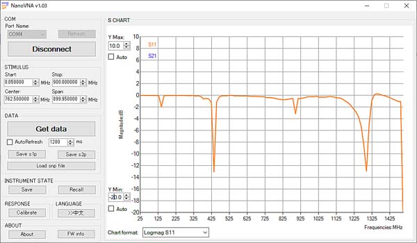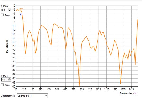 S11(反射係数)の表示。縦軸は0dB~-40dB、横軸は25MHz~1500MHz。