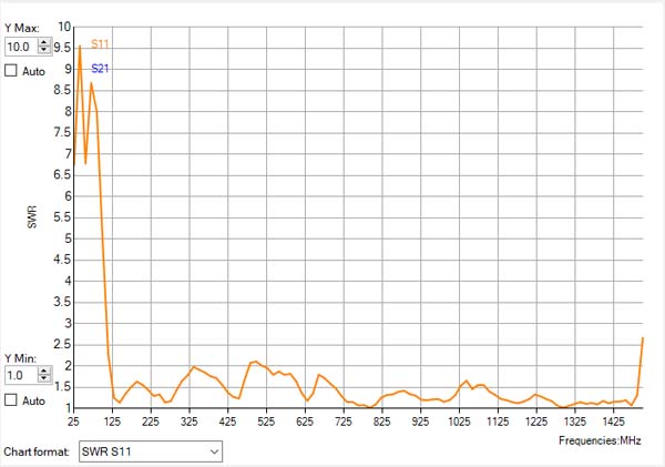 VSWRで表示するとこんな感じ。縦軸が1~10、横軸は25MHz~1500MHz。