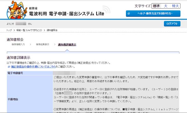 住所変更を行い、再度申請を行いました。