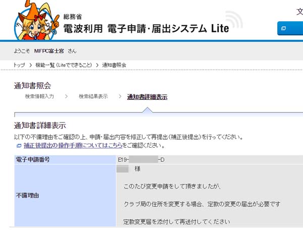 さっそく、関東総合通信局から補正依頼の連絡が来ました(汗)