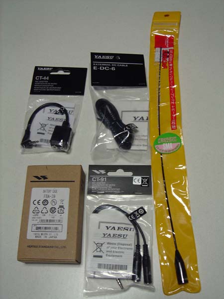左上から、FT1XD用マイクアダプター「CT-44」、電池ケース「FBA-39」、FT1XD・VX-7B用DCケーブル「E-DC-6」、VX-7B用マイクアダプター「CT-91」、アンテナ「SRH36」。CQオームで購入。「CT-44」が918円、「FBA-39」が2,662円、「E-DC-6」が532円、「CT-91」が918円、「SRH36」が2,684円なり。