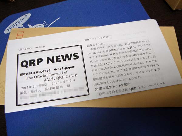 ちょっと前の話ですが、JARL QRPクラブから、紙版の会報が届きました。